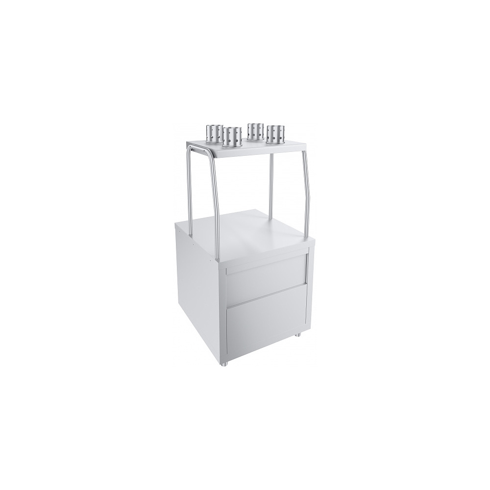 Стойка для приборов Пищевые Технологии Лира-Профи СП/ЛП используется в составе линий раздач на предприятиях общественного питания и торговли для хранения столовых приборов и подносов. Модель оснащена 4 стаканами с перфорацией, столешницей для установки подносов и регулируемыми по высоте ножками. Корпус и стаканы для приборов выполнены из нержавеющей стали.
